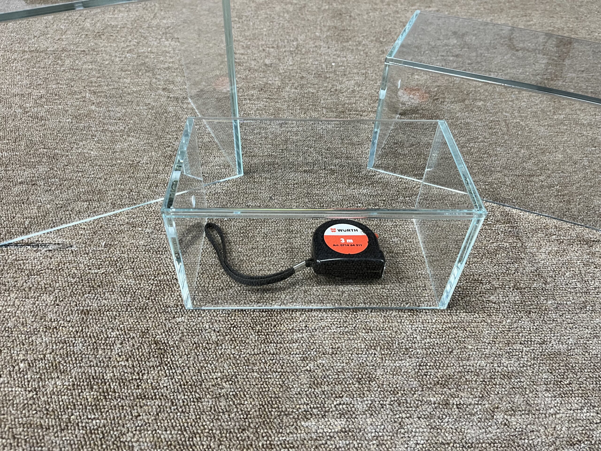 Iš stiklo galime klijuoti įvairius gaminius: stiklinius stalus, kubus, lentynas, vitrinas ir t.t.
